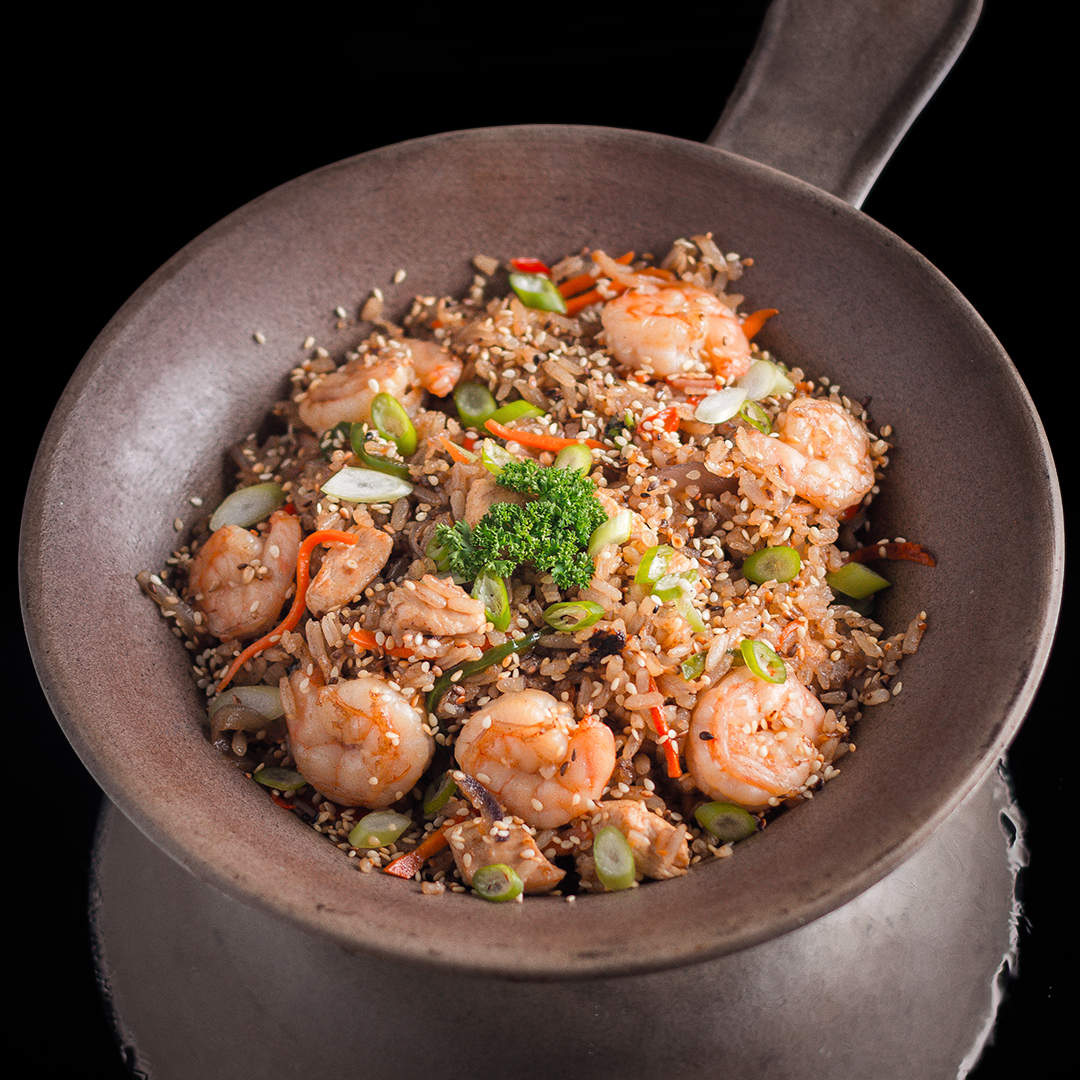 Uno de los principales de la línea wok del restaurante. Se basa en cebolla morada, zanahoria, raíces, champiñones, ajo, jengibre, y pollo con camarones previamente seleccionados.