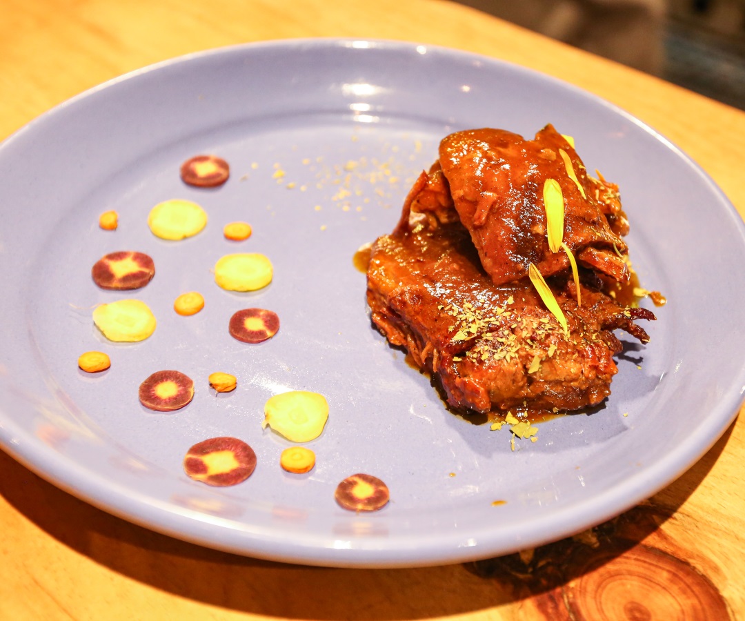 Sobrebarriga cocinada en pozo profundo con un tiempo de cocción de más de seis horas, lo cual le añade suavidad y textura. El plato es acompañado por monedas de papas nativas que son traídas al restaurante sin intermediarios.