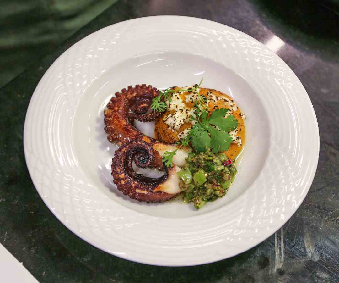 Pulpo a la brasa con salsa verde fresca. El plato está acompañado con zapallo con queso Oaxaca tatemado, que consiste en una técnica para asar o tostar los alimentos sobre un recipiente llamado comal.