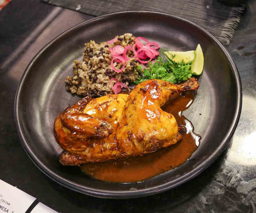 Pollo con adobo yucateco, el cual le agrega sabores intensos al plato, acompañado de la mezcla de arroz de fríjol negro y cebolla roja. El plato tiene ingredientes que rememoran los ingredientes usados en México.