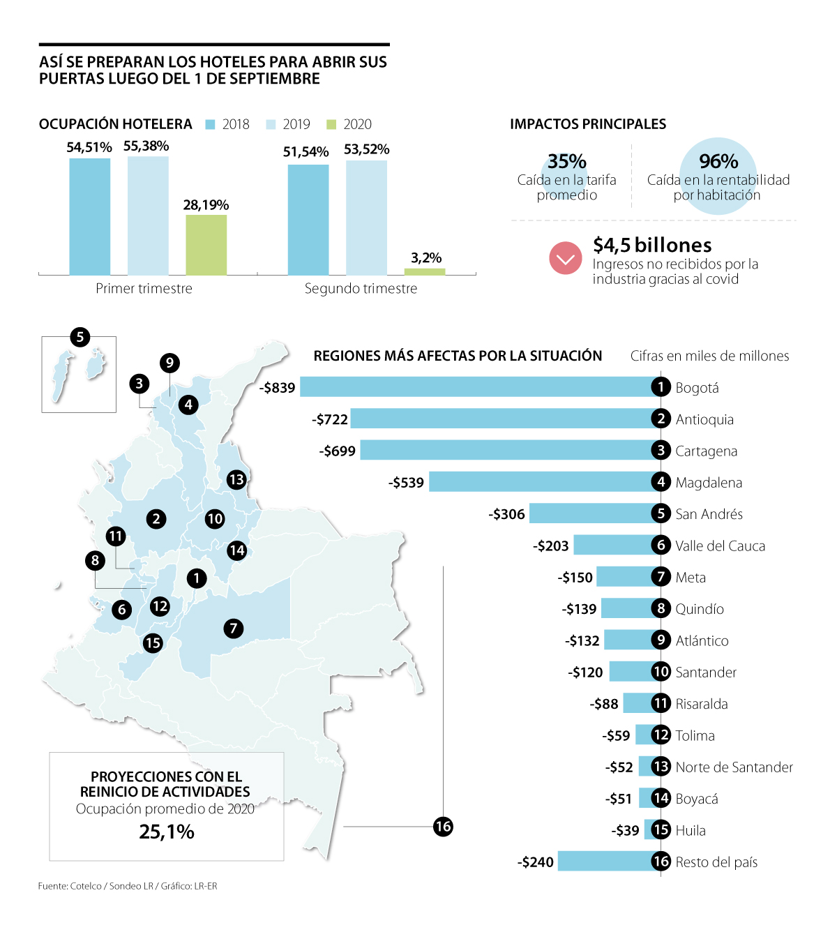 Es por esto que el sector tiene la esperanza puesta en la reapertura, ya que Presidencia dio la autorización para que hoteles reinicien operaciones y el inicio de viajes empiece el 1 de septiembre en el territorio nacional. La noticia es más que un alivio para la industria que al cierre del primer semestre registró pérdidas por $4,5 billones, siendo Bogotá, Antioquia, Cartagena, Magdalena y San Andrés los lugares más afectados.