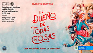 El Teatro Colón de Bogotá inaugura la franja #PequeñoColón de 2019 este domingo a las 11:00 a.m. con el musical El Dueño de Todas las Cosas. Esta es la historia de un grupo de artistas circenses que se adentran en una aventura por el mar a causa de la persecución del supuesto dueño del circo, lo que los llevará a nuevos continentes, países, culturas y personajes.