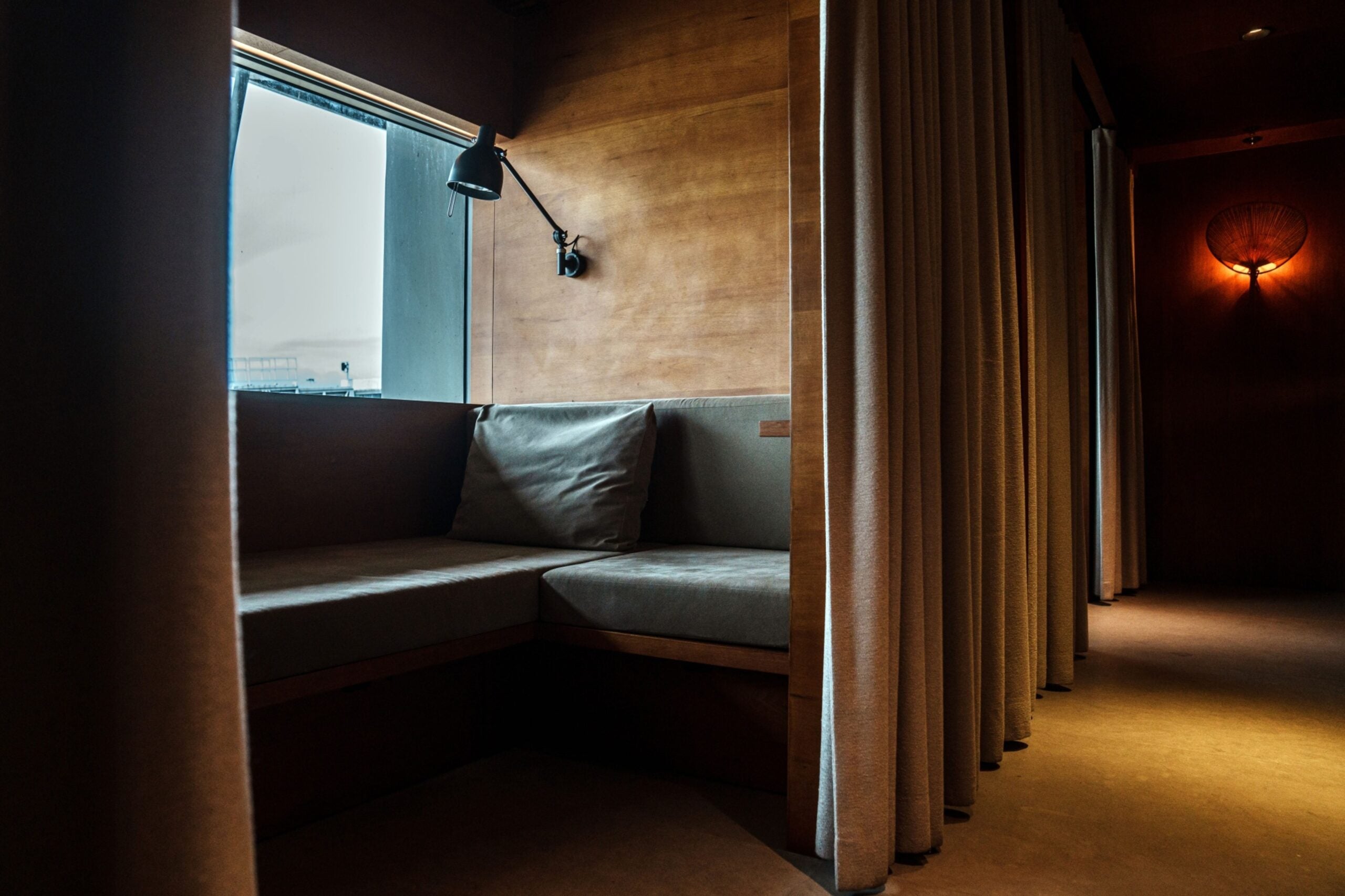 En otro mostrador de recepción, los huéspedes pueden reservar masajes gratuitos, una ducha o una suite con una cama. El restaurante está al final de la habitación. El menú incluye hamburguesas con queso de ternera Wagyu, huevo del siglo marinado y empanadillas caseras de gambas y cerdo con fideos wonton. La lista de bebidas y vinos es extensa.
