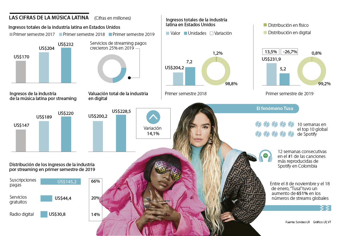 Es por esto que los datos de la industria de la música latina en Estados Unidos también están en constante crecimiento. Las más recientes cifras a muestran como en el primer semestre de 2017 se registraron ingresos totales de US$170 millones, cifra que al mismo periodo de 2018 cerró en US$204 millones y con una variación de 13,5% la industria llegó a US$232 millones en el primer semestre de 2019, según información de Recording Industry Association of America (Riaa). Esto significaría cerca de 10% de las ventas de la industria por streaming en el país, que llegan a cerca de U$2.250 millones en el semestre.