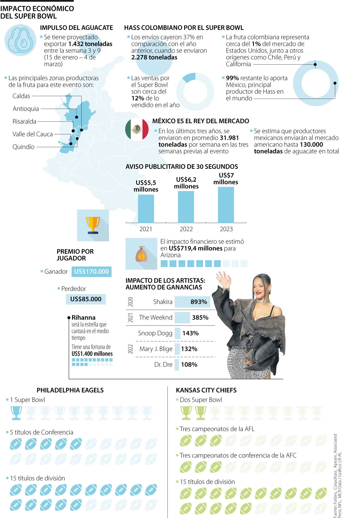 Como cualquier espectáculo, los alimentos y bebidas también se ven beneficiados. Según la National Chicken Council, durante el fin de semana en el que se jugará la final se comerán 1.420 millones de alitas. A esto, se le sumarán 160 millones de alitas veganas, según Compassion in World Farming. A este famoso plato estadounidense también se le agrega el aguacate hass en todas sus presentaciones, en un mercado en el que a pesar de que México es el rey indiscutible, Colombia también se verá beneficiado.