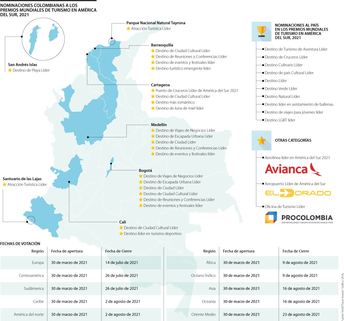 Que estos destinos estén nominados, junto con grandes iconos del continente se explica, según la directora de Procolombia, Flavia Santoro, porque “el mundo tiene sus ojos puestos en cómo Colombia está trabajando por la industria, y con mayor determinación en esta coyuntura”, dijo.