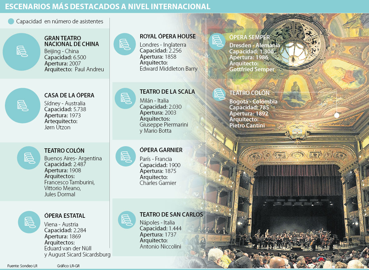 En listados de este tipo, como también de National Opera, figuraron espacios como el Teatro de San Carlos de Nápoles (Italia), el escenario para ópera activo más antiguo del mundo, así como la Casa de la Ópera de Sídney o el Gran Teatro Nacional de China, lugares con capacidades de 5.738 y 6.500 personas, respectivamente.