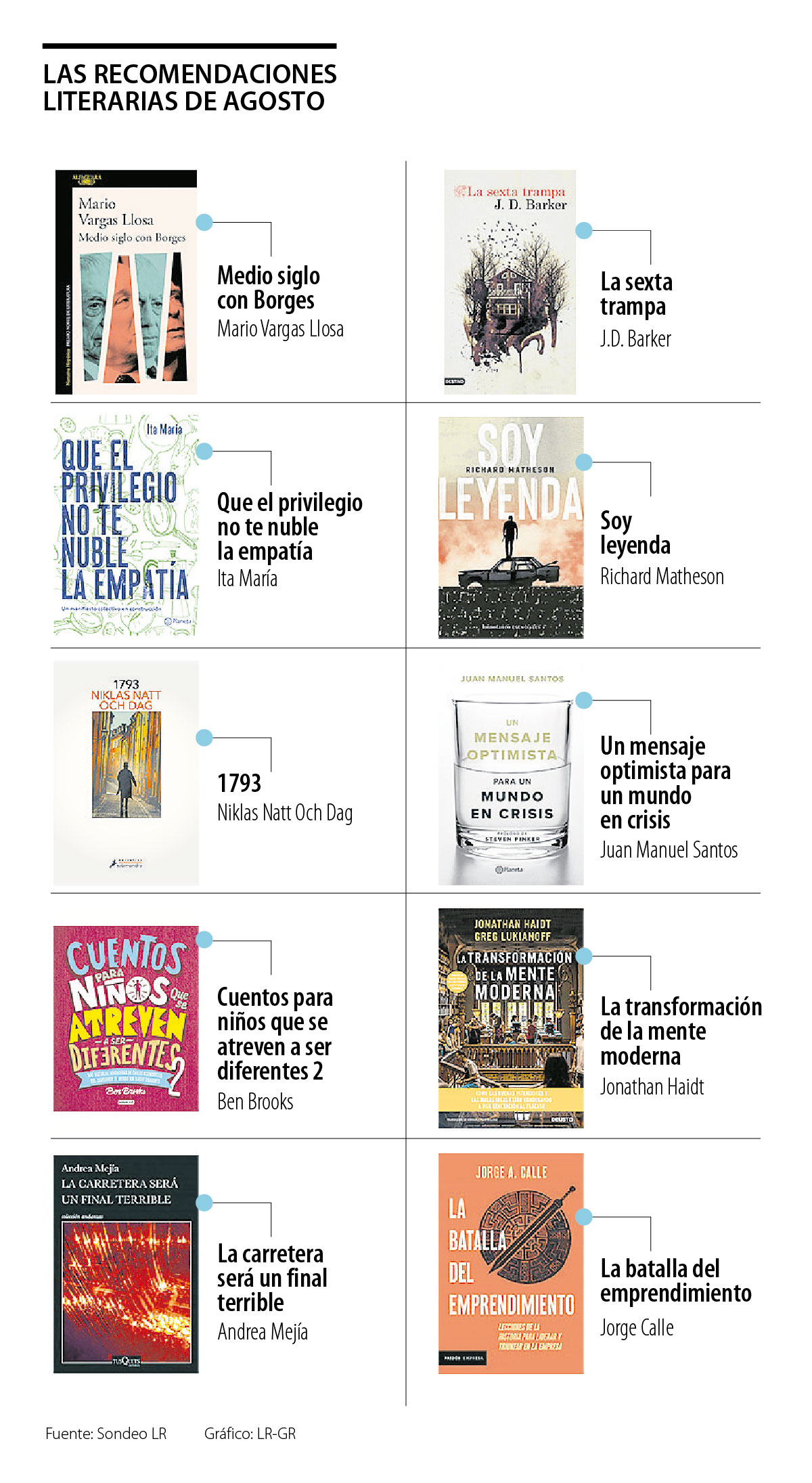 En la lista las editoriales destacaron los lanzamientos de Mario Vargas Llosa, Juan Manuel Santos y Richard Matheson. Primero, el escritor peruano y premio Nobel de literatura Mario Vargas Llosa publicó ‘Medio siglo con Borges’ de la mano de la editorial Alfaguara. El autor describe el texto como “«una colección de artículos, conferencias, reseñas y notas de testimonio de más de medio siglo de lecturas de un autor que ha sido para mí, desde que leí sus primeros cuentos y ensayos en los años cincuenta, una fuente inagotable de placer intelectual”.