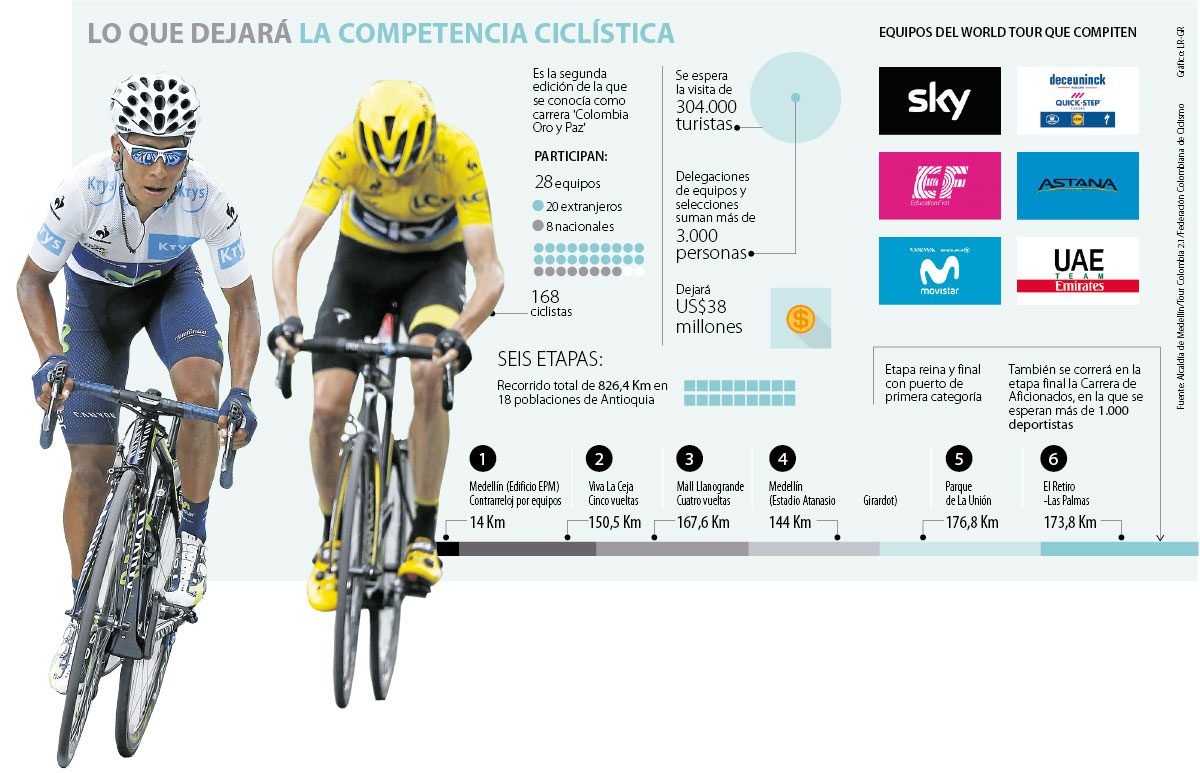 Pero más allá del ámbito competitivo que congrega a 28 equipos y 168 ciclistas de todo el mundo, la capital de Antioquia, el Valle de Aburrá y los municipios del Oriente cercano acogerán durante esta semana a casi 304.000 turistas locales y extranjeros que llegarán a apreciar el evento ciclístico de mayor importancia en la historia del país.