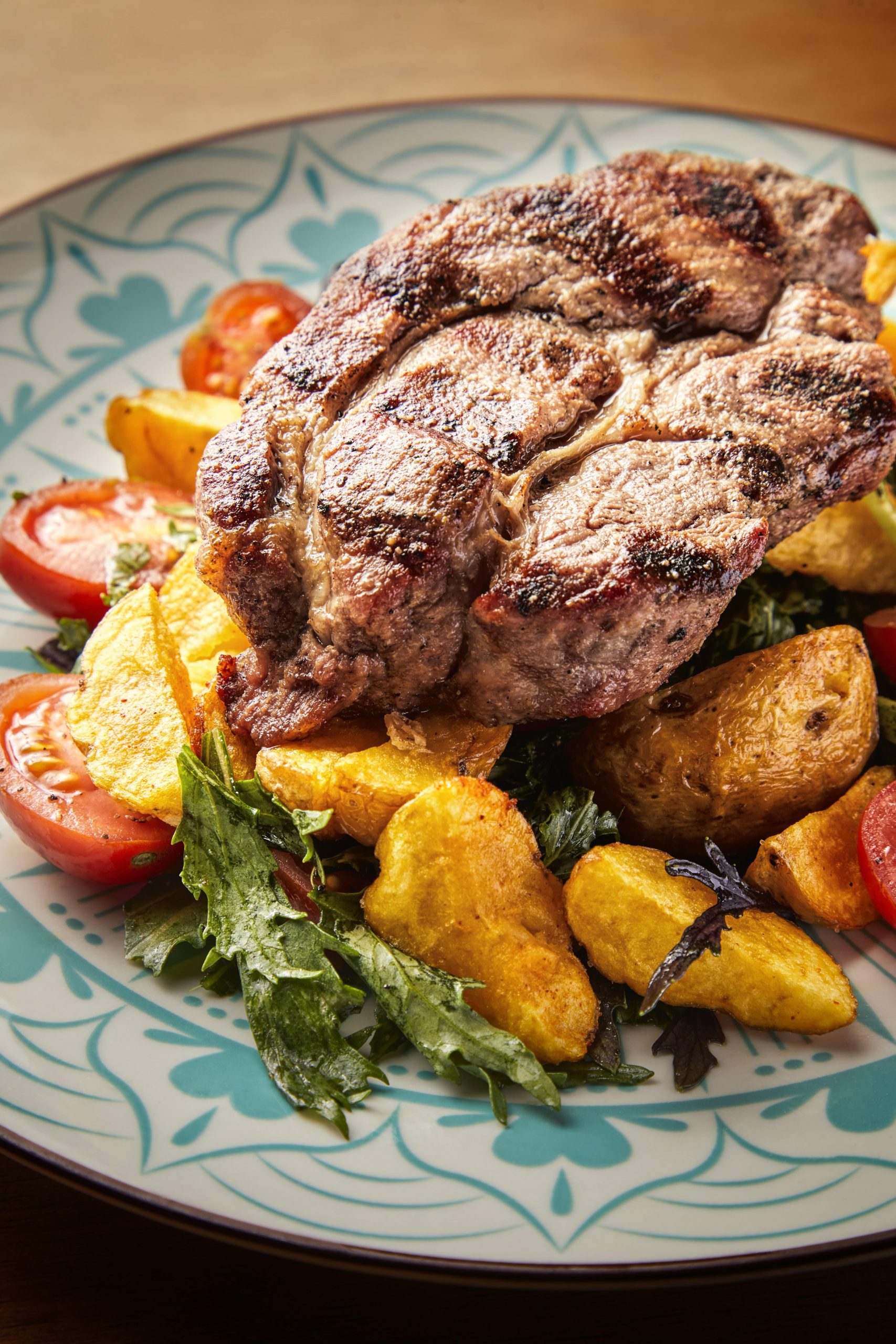 Bondiola de cerdo marinada en aceite de oliva, hierbas de jardín, hechas a la parrilla y servida sobre hojas orgánicas y cascos de papa criolla fritas. El corte de esta carne de cerdo es jugoso y blando.