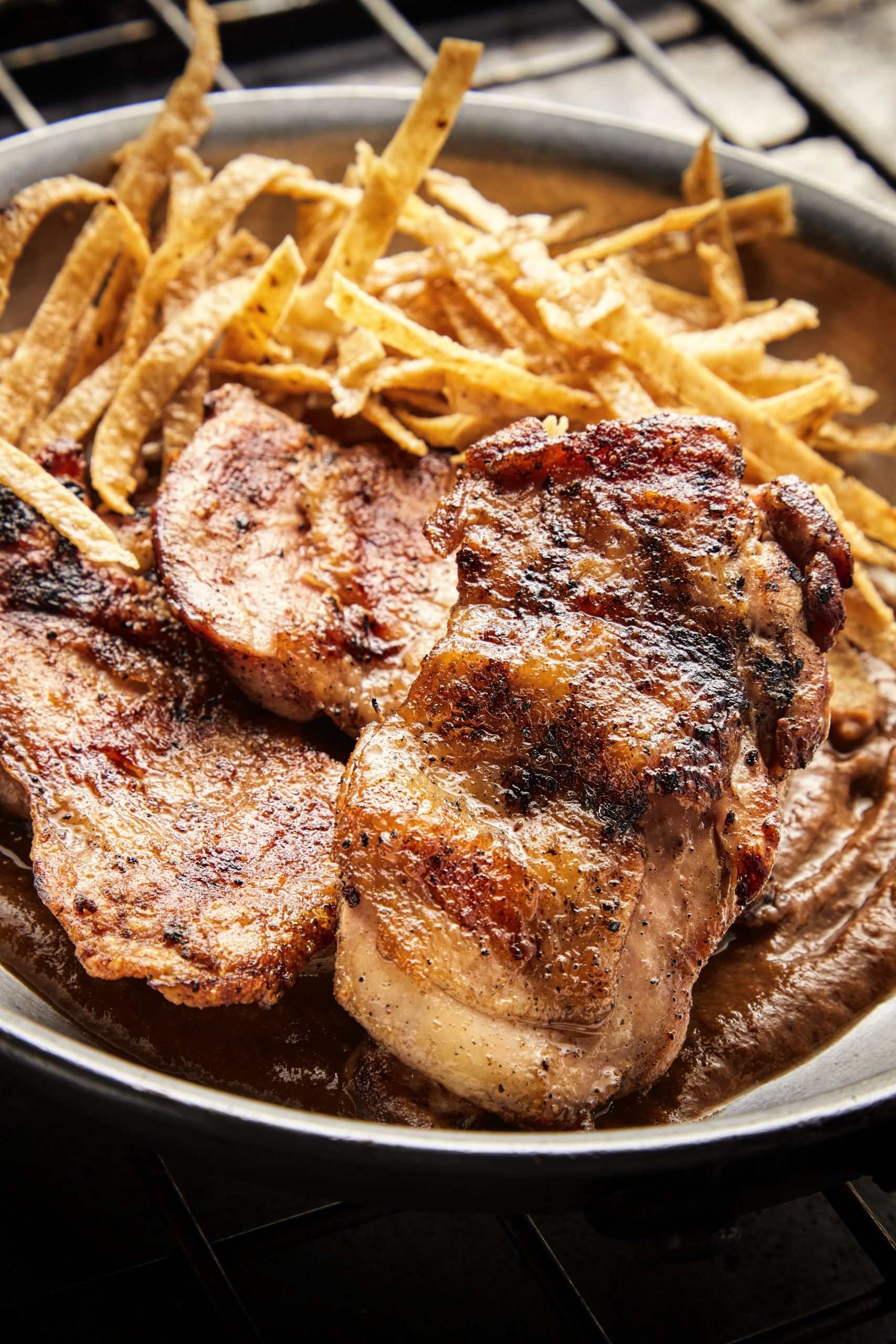 Pollo marinado servido con una salsa ligeramente picante de fríjol, chile ancho y chicharrón. Este viene con tortillas de maíz frito y es perfecto para acompañar con una copa de vino tinto malbec.