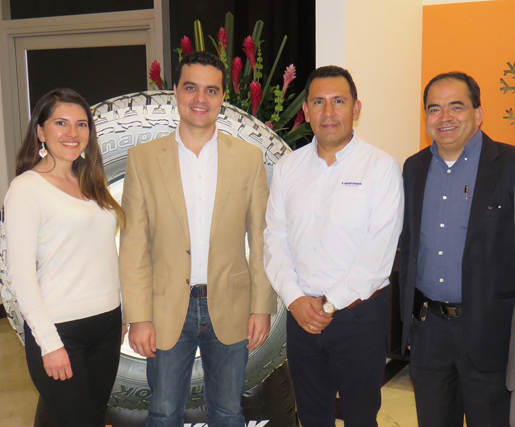 Hankook Tire realizó el lanzamiento de sus referencias de llantas para los sectores de camión, automóvil y camioneta. Al evento asistieron - directivos y ejecutivos de la compañía, clientes y distribuidores autorizados de la marca en Colombia. En la foto: Claudia Castro, gerente de mercadeo de Hankook Tire Colombia; Leonardo Maya, director de mercado de llantas de Coéxito; José García, gerente de la línea TBR de Hankook Tire; Carlos Cruz, gerente comercial de Hankook Tire; y Jonathan Alfaro, analista de investigación de mercados de Hankook Tire.