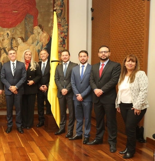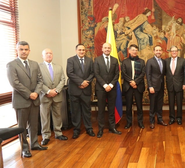 Juan P. Casas, dir. Facultad Ingeniería Mecánica Uniandes; Andrés F. Gómez, dir. Facultad Ingeniería Eléctrica Uniandes; Luis A. Camacho, dir. Facultad Ingeniería Civil y Ambiental Uniandes; Andrés González, dir. Facultad Química Uniandes; Alfonso Reyes, decano de Ingeniería Uniandes; Jaime Hill, pte. Holcim; y Pablo Navas, rector de la Uniandes.