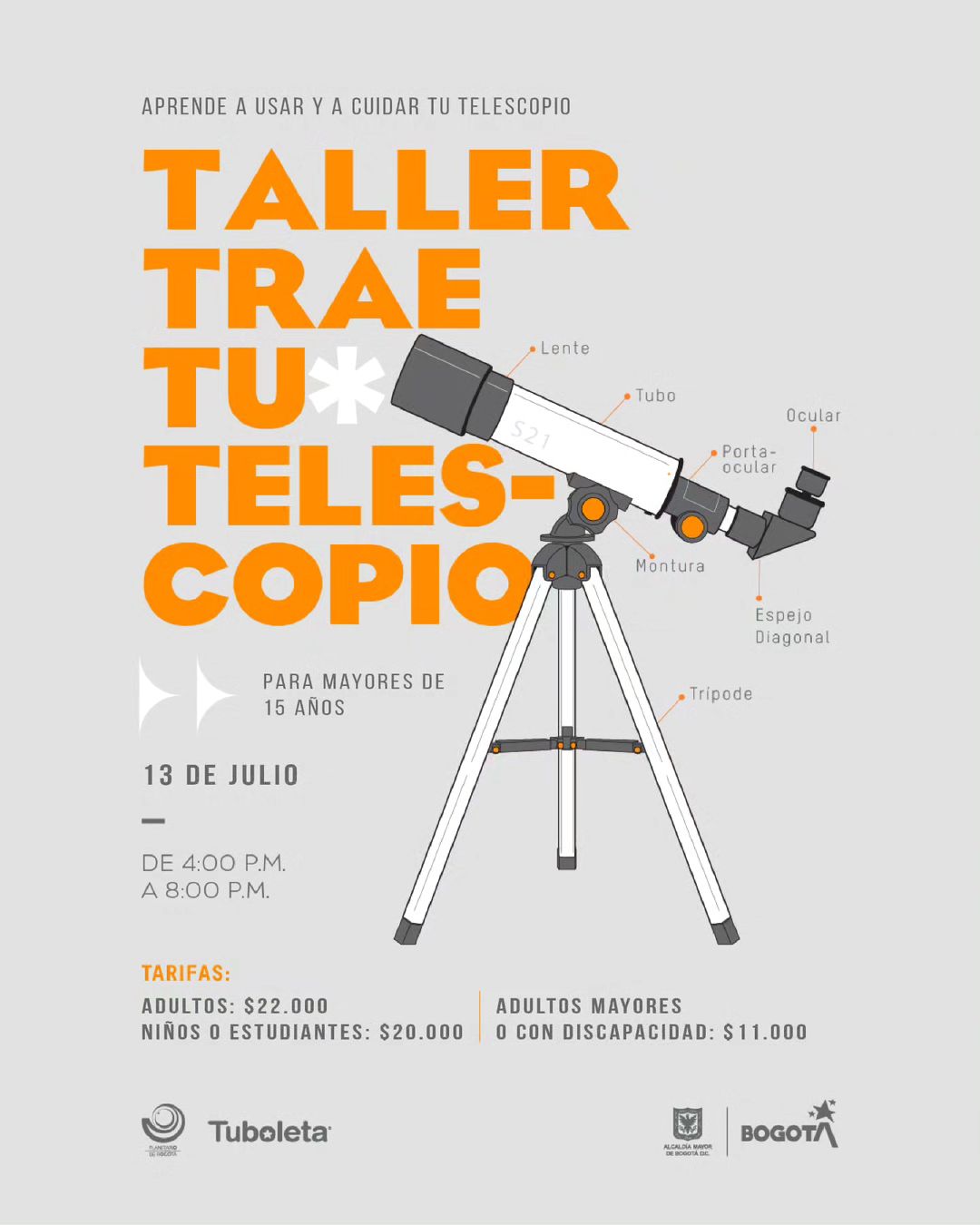 “Trae tu telescopio” es el taller que ofrece el Planetario de Bogotá para los aficionados a la astronomía. A partir de las 4:00 p.m., personas a partir de los 15 años podrán asistir a este evento que le dará las bases para poder usar de manera adecuada su telescopio, y si en llegado caso no tiene, pero le gustaría explorar más sobre este tema, el planetario le ofrecerá una guía.