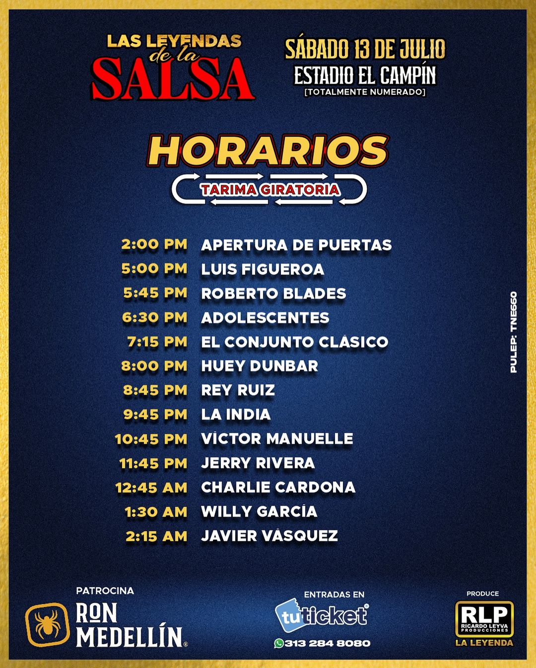 Artistas como Jerry Rivera, Roberto Blades y Willy García son los protagonistas de este gran evento. Las últimas boletas que están disponibles las podrá encontrar en la página de Tuticket desde $150.000 hasta $12.500.000, si desea estar en un palco. La apertura de las puertas del estado Nemesio Camacho El Campín se hará desde las 2:00 p.m.