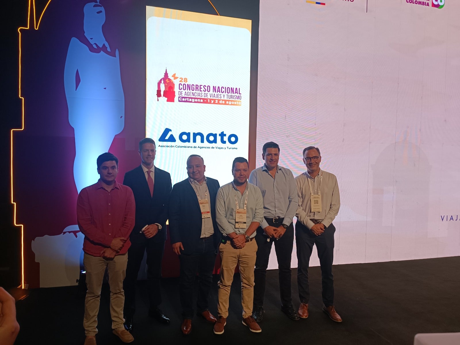Felipe Gutiérrez, CEO de Clic; Scott Lantz, country Manager de Emirates en Colombia; Manuel Ambriz, chief commercial officer de Avianca, Diego Vásquez, presidente Junta Directiva Nacional de Anato; Santiago Álvarez, dir. ejecutivo de Latam; y Mario García, country Manager Colombia Jetsmart.