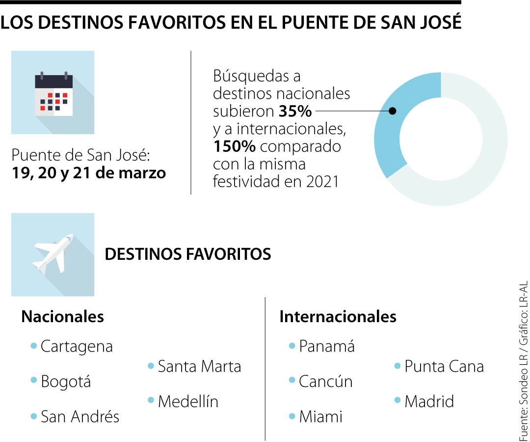 Según un análisis realizado por Despegar Colombia, las búsquedas de destinos nacionales en estas fechas aumentaron 35% y de internacionales, 150%, a comparación del puente de San José de 2021. Esto significa que cada vez más personas están dispuestas a viajar, debido a las pocas restricciones por el covid-19 y el bajo número de contagios diarios.