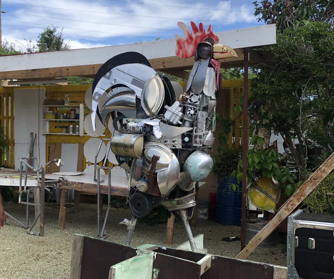 Leones, gallos, aves y cualquier tipo de escultura fabrica Sling a partir de la basura que recicla. Partes de carros, computadores, lavadoras se alcanzan a observar en las figuras que crea.