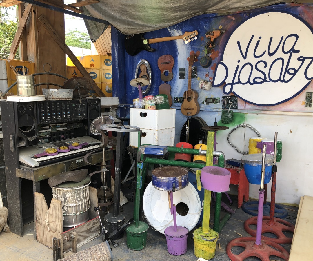 Baldes, maletines de taladros, cajas y hasta piezas de las lavadoras que normalmente terminarían en un basurero se convierten en piezas de música, gracias al trabajo que realiza el artista Omar Sling, cuyas obras ya son características de Curazao.