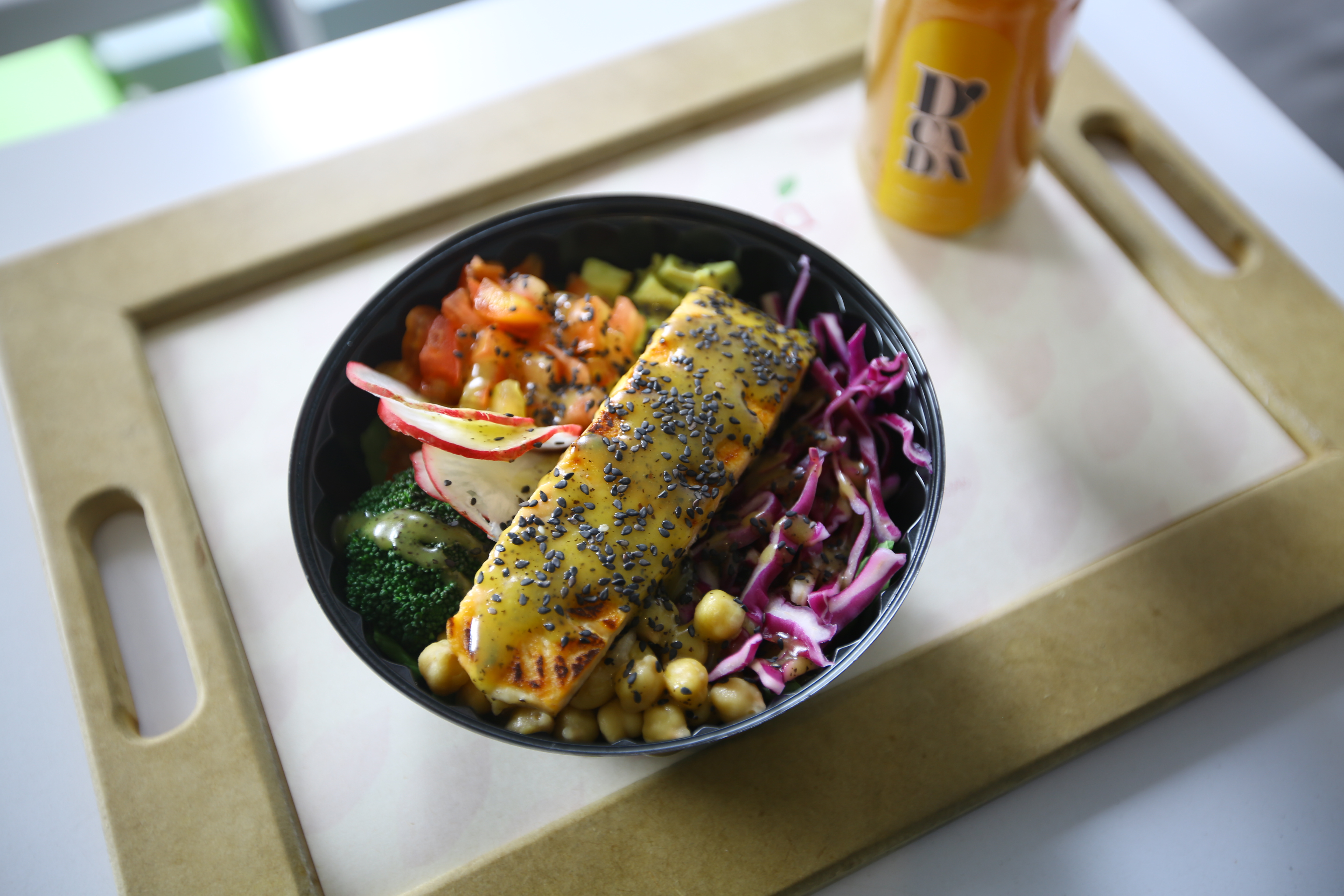 En cuanto a la oferta de bebidas, el lugar tiene una variedad de jugos que vienen con una base de leche de coco, zumo de naranja, mandarina, té verde, leche deslactosada o yogur.