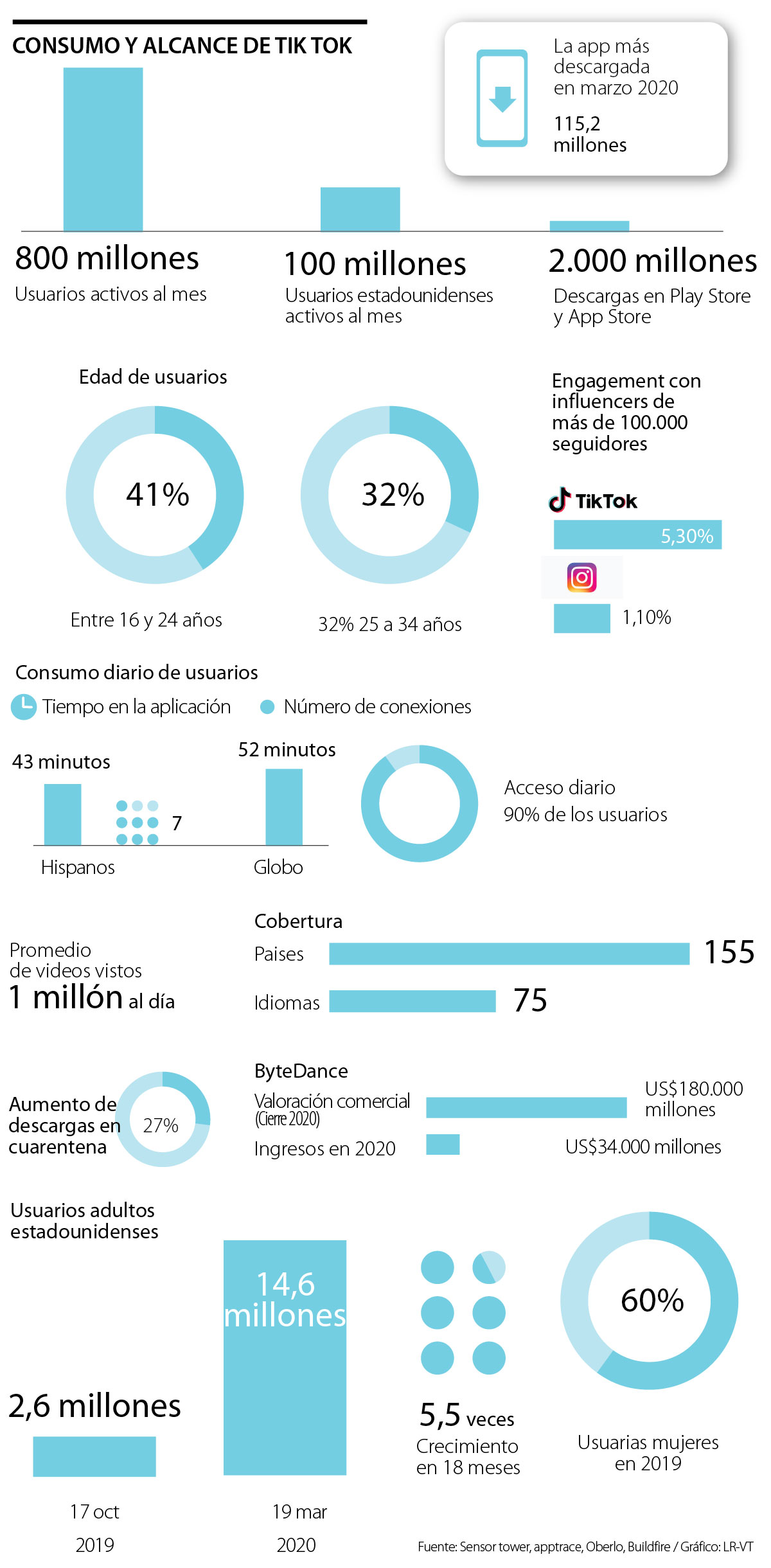 Desde que la aplicación es de libre descarga en 2018 hasta el día de hoy, ya está en lo más alto de las redes sociales (así al interior de TikTok se definan como una comunidad y no como red social). De hecho, han aparecido consultoras que, extraoficialmente, dicen que ya suma más de 2.000 millones de descargas y tiene una base de 800 millones de usuarios activos, de los cuales Colombia podría colocar entre 15 y 20 millones.