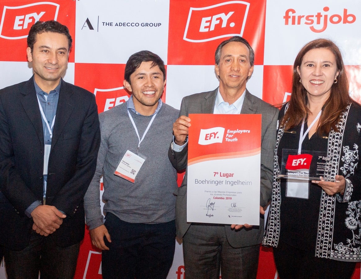 Se llevaron a cabo los premios EFY 2019, que reconocieron a las mejores empresas para Jóvenes Profesionales en Colombia. Dentro de los diez primeros puestos destaca la compañía Boehringer Ingelheim como la segunda farmacéutica que escogen los jóvenes para trabajar. En la foto: Nelson Montenegro, gerente de finanzas y administración de Boehringer Ingelheim S.A.; Edison Núñez, analista de recursos humanos; Jorge del Río, gerente, general de Boehringer Ingelheim S.A.; María Elvira Rodríguez, gerente de recursos humanos de Boehringer Ingelheim S.A.
