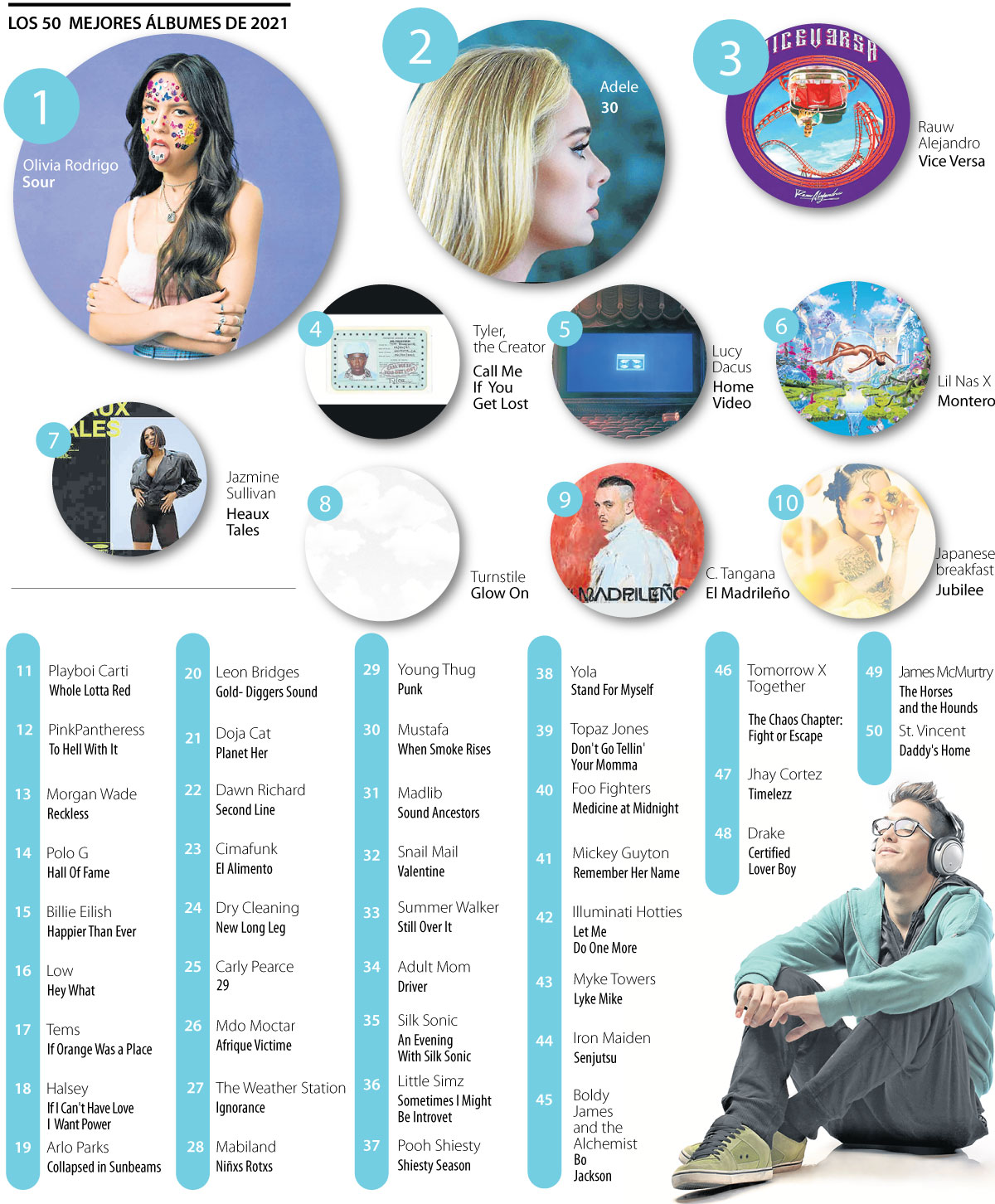 Para 2021 el ranking ya fue publicado, y aparece un grupo de 50 álbumes ideales para los primeros días de 2022 como ha sido tradición. Olivia Rodrigo, quien pasó de ser estrella en Disney a un ícono del pop tiene el número uno con ‘Sour’. Pero resalta que el medio centenar tiene bastante pop-rock, hip-hop y reguetón.