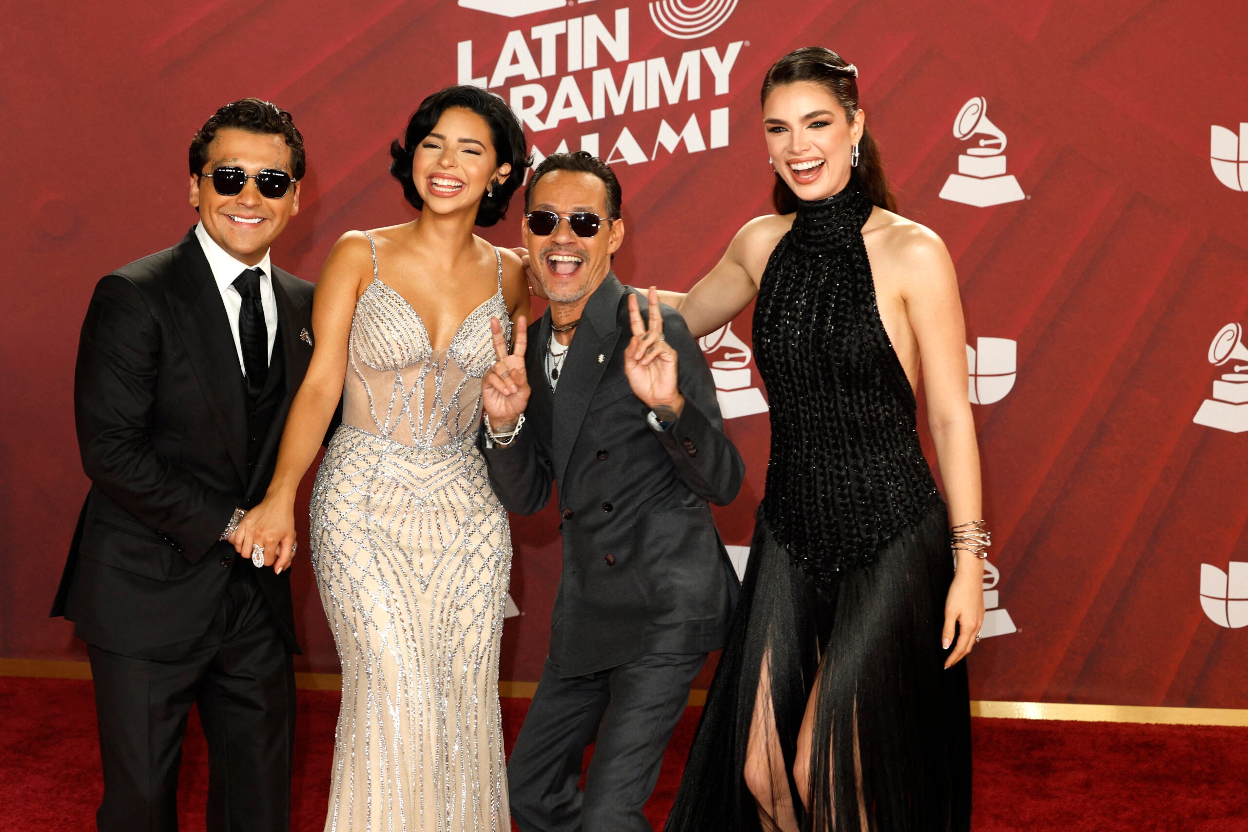 En la foto aparecen los cantantes mexicanos: Christian Nodal y Ángela Aguilar; junto con el artista Marc Anthony y la modelo Nadia Ferreira.