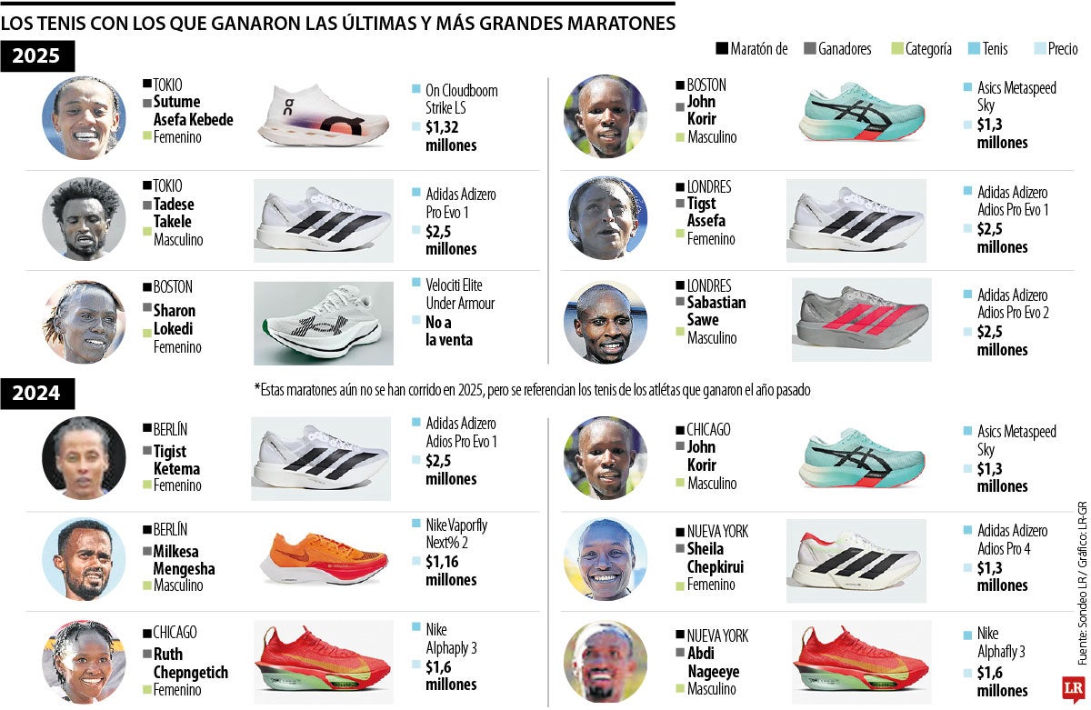 El año pasado, los ganadores de la Maratón de Nueva York fueron Sheila Chepkirui en la categoría femenina y Abdi Nageeye en la masculina. Chepkirui corrió con unas Adidas Adizero Adios Pro 4, valuadas en $1,3 millones y reconocidas por ser el calzado más ganador del mundo. Por su parte, Nageeye compitió con las Nike Alphafly 3 ($1,6 millones).