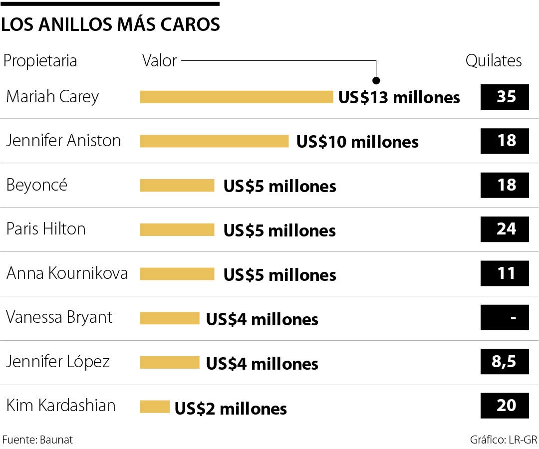 En el primer lugar de este ranking se encuentra el anillo de compromiso que la cantante Mariah Carey recibió en 2016 por parte de su exprometido James Packer. Su avalúo estaría cercano a los US$13 millones, al parecer, por su característico diamante de 35 quilates de talla esmeralda.
