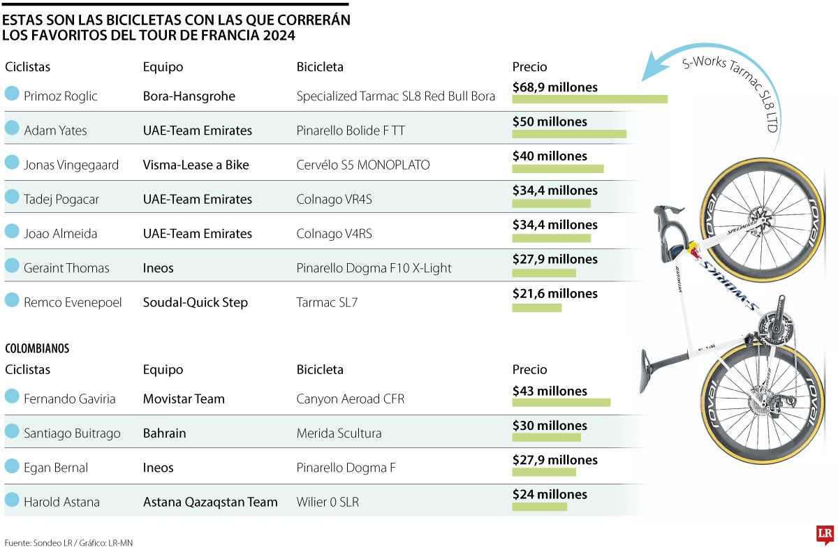 La bicicleta más cara de los que figuran como favoritos es la Specialized Tarmac SL8 Red Bull Bora de Primoz Roglic, valorada en $68,9 millones.