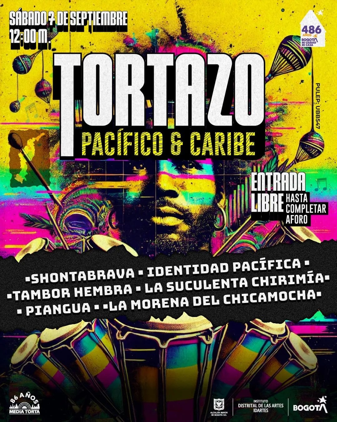 Hoy en el teatro al aire libre La Media Torta, desde el medio día, podrá disfrutar en familia de los sabores de la música del Pacífico y Caribe con seis exponentes que serán los protagonistas de este show. La Morena del Chicamocha, Pinagua Música, La Suculenta, Agrupación Identidad Pacifica, Tambor Hembra y Shontabrava serán las agrupaciones que se presentarán.