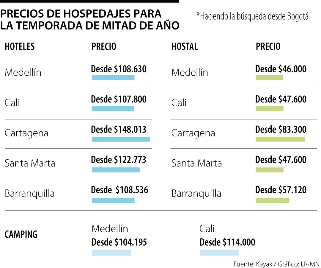 Pero si lo suyo es el hotel, podrá reservar para las vacaciones de mitad de año desde $107.800 la noche una habitación para una persona. Según Kayak, los cinco destinos más solicitados para la temporada son Barranquilla, Santa Marta, Cali, Cartagena y Medellín. De estas ciudades, el hotel más barato lo consigue en Cali, seguido Medellín y Barranquilla, desde $108.630. Entre los destinos más costosos para este tipo de hospedaje está Cartagena, con tarifas desde $148.013 por persona, y Santa Marta, desde $122.773.