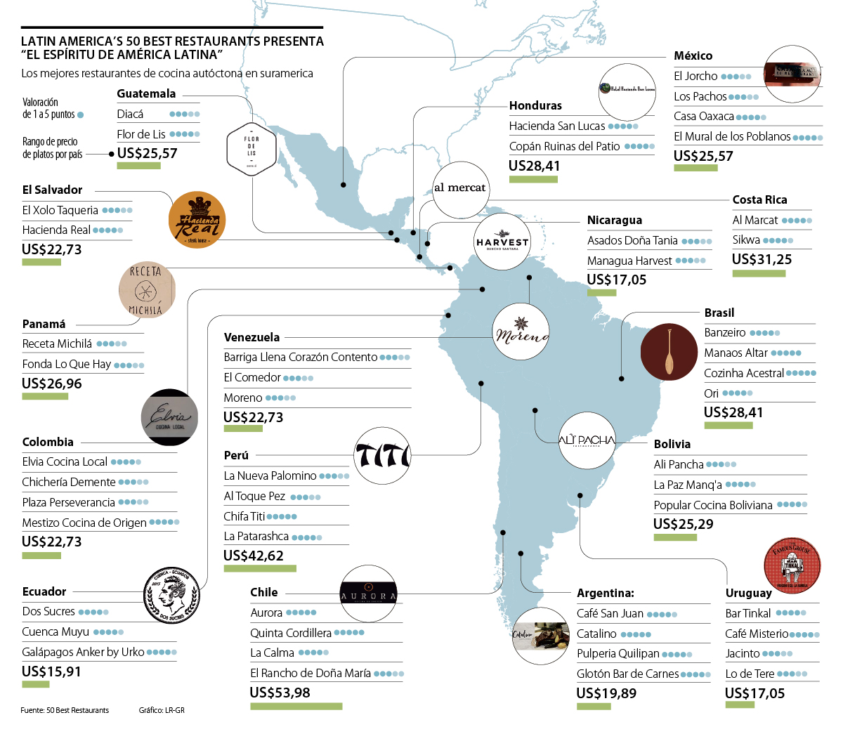 Perú, México, Argentina, Chile, Colombia y Brasil son algunos de los países que destacan en este listado con propuestas gastronómicas innovadoras que reúnen lo mejor de los elementos tradicionales, que de acuerdo con William Drew, director de Contenidos de Latin America’s 50 Best Restaurants “no solo celebra a los que han aportado algo diferente al sector gastronómico de cada país, sino a aquellos que han brindado algo más a las comunidades locales. Es una representación de las tradiciones más arraigadas y sinceras de cada lugar”.