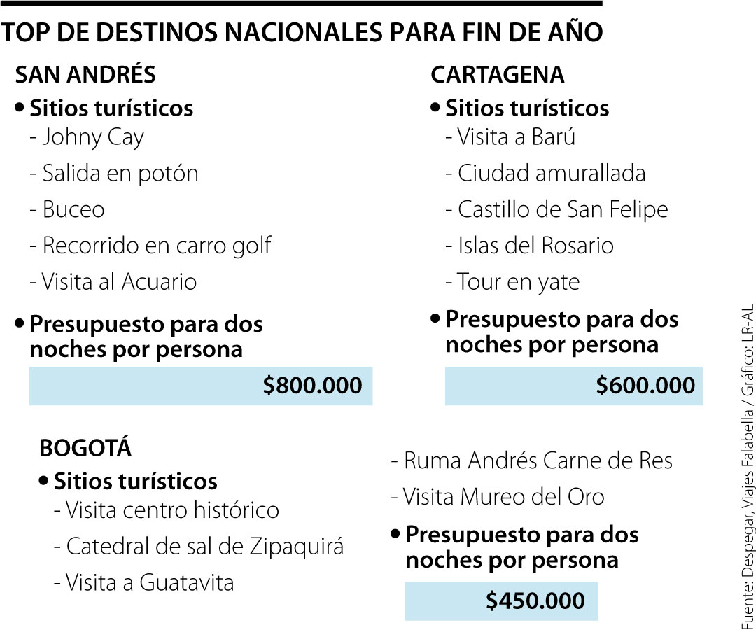 Y es que si bien es cierto que los gustos del viajero influyen en los recorridos, estos atractivos coinciden en puntos relevantes que hay que conocer. En Bogotá, por ejemplo, María Fernanda Rosero, gerente de Producto de Viajes Falabella recomienda el city tour por el centro histórico, las visitas a la Catedral de Sal de Zipaquirá y la rumba en Andrés Carne de Res. Esta empresa argumenta que dos noches en la capital del país puede requerir un presupuesto de $450.000 y para Cartagena el cálculo es de $600.000, mientras que en San Andrés se debe contar con el dinero más elevado del ‘top’, $800.000 por las mismas dos noches.