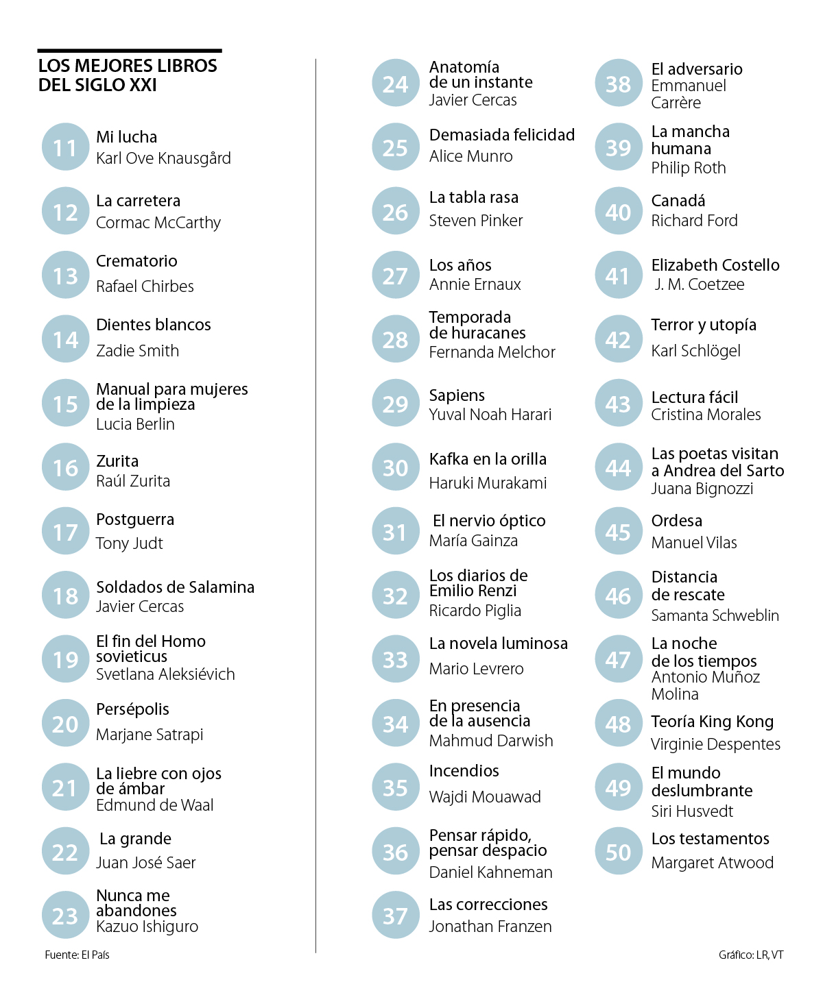 Con 84 expertos, la revista cultural del diario español El País, llamada Babelia, reveló cuáles han sido los mejores libros de lo que va del siglo XXI, según la influencia de las obras en las nuevas generaciones.