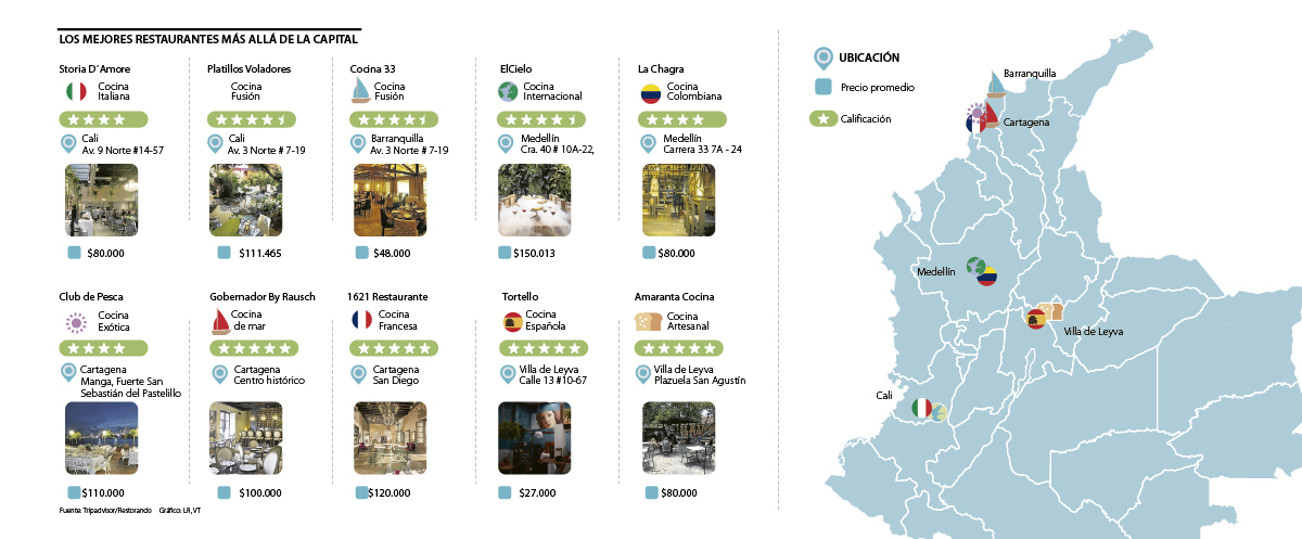 Pero para expertos y cocineros, eso no quiere decir que la mejor gastronomía se encuentre exclusivamente en la capital. Algunos portales como TripAdvisor o Restorando se han dedicado a hacerle seguimiento a propuestas de alto nivel en otras ciudades principales como Medellín y Cali; zonas turísticas como Cartagena; o algunas más pequeñas y coloniales como Villa de Leyva.