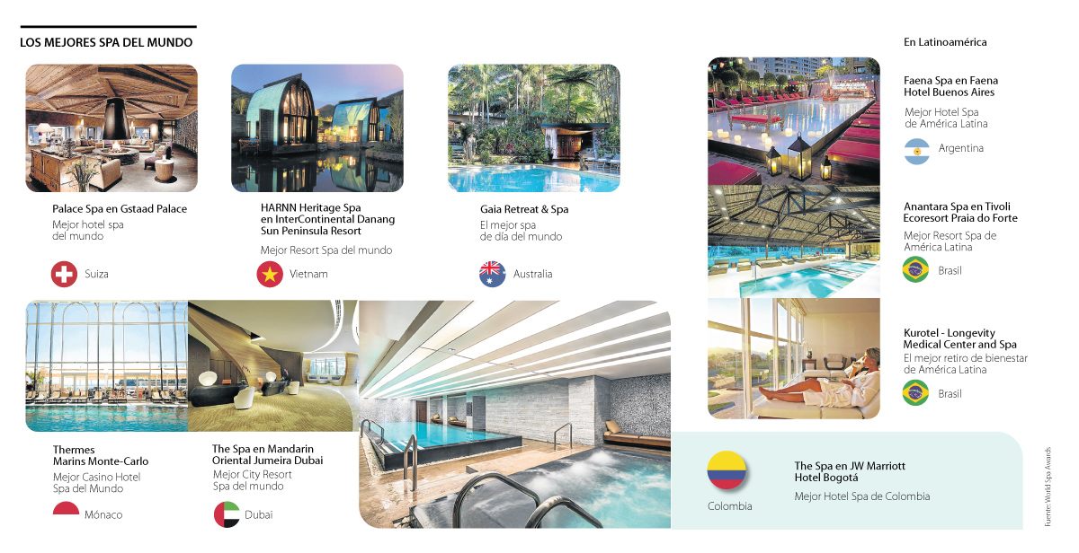 En el caso de Colombia el reconocimiento a mejor spa del país fue para el spa del hotel JW Marriott de Bogotá, que ganó a otros nominados como el Bastión Luxury Hotel Spa, OneOne Day Spa del 101 Park House o el spa del hotel Charleston Santa Teresa.