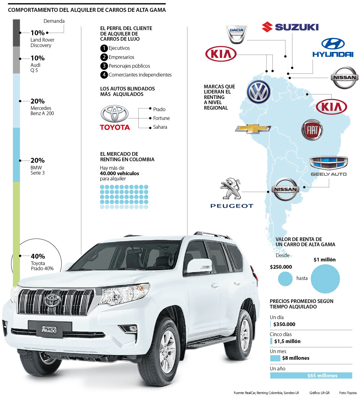 Dentro de las variadas opciones de empresas para alquiler de autos sofisticados el reporte arroja que uno de los modelos más cotizados por estos clientes es Toyota, que ofrece desde mayor seguridad al cliente, confort, y hasta la posibilidad de blindaje. Por ejemplo, ahí figuran referencias como la Toyota Prado que en empresas como Realcar representan 40% de la demanda.
