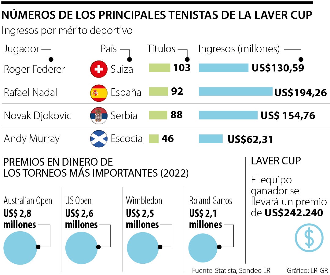 Sin embargo, Federer no es el único de los tenistas participantes de la Laver Cup que cuenta con un amplio palmarés, o con ingresos deslumbrantes. Por ejemplo, al calificar a los jugadores por los títulos obtenidos, el segundo dentro de ese pequeño ranking sería Rafael Nadal.