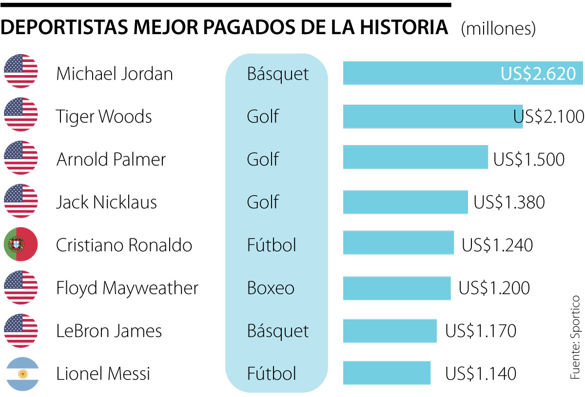 Pero como Jordan, hay un buen número de deportistas que entendieron que su peso en las canchas podría ser explotada a fuertes cantidades, a él le siguen Tiger Woods, el golfista que se involucró en las inversiones de finca raíz, salud, y hotelería ha logrado más de US$2.100 millones para su fortuna personal.