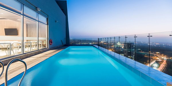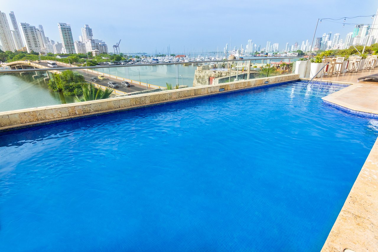 En este hotel la piscina está ubicada en el piso 14 en una terraza con vista directa al atardecer y la ciudad de Cartagena. La piscina para adultos tiene medidas de 15,75 mts de largo x 5,20 mts de ancho, y una profundidad de 1,40 mts en toda la extensión de la piscina. Mientras que la de pequeños, es una zona asimétrica con una profundidad de 60 cm. Cuenta con sillones de descanso y bronceo.