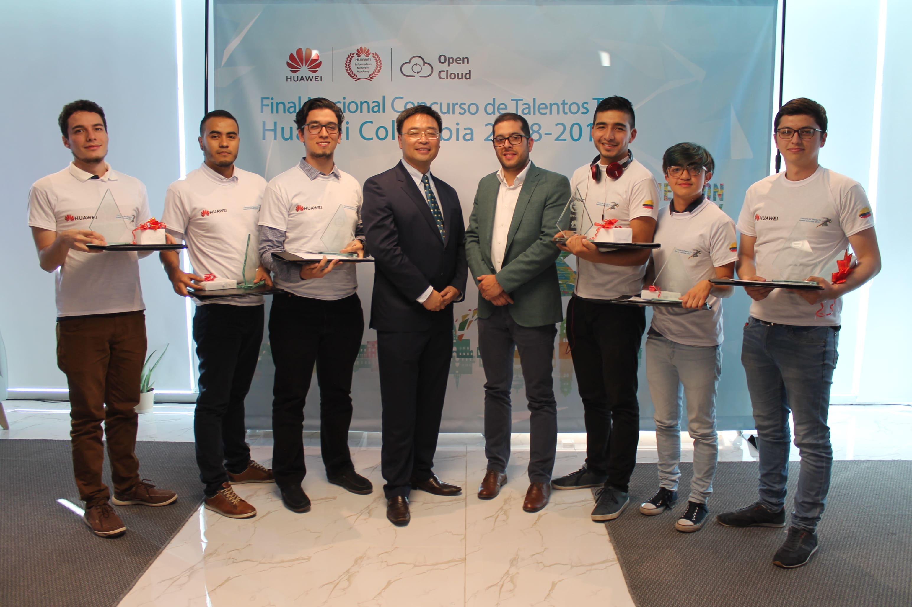 Daniel Londoño, Andrés Felipe Medina y Luis Miguel Paz, ganadores de la categoría Redes; Qin Hua, presidente de Huawei Colombia; Iván Castaño, director de desarrollo de la industria de las tecnologías de la información del Ministerio TIC; Pedro Berrío, Luis Otálora y Joan Torres, ganadores de la categoría Cloud.