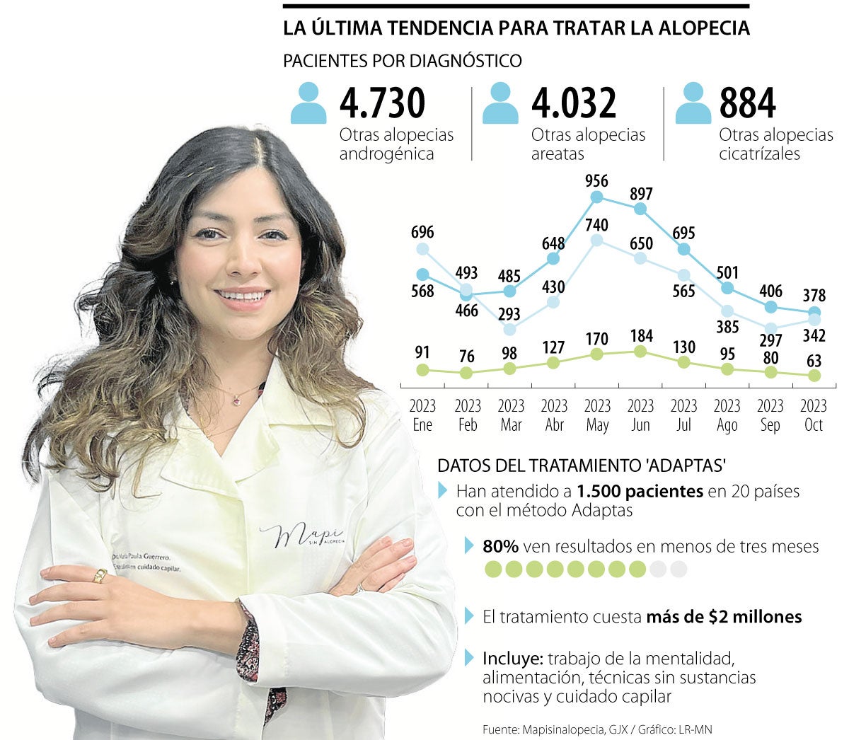 El tratamiento que está dando de qué hablar fue creado por el centro Mapisinalopecia y se llama el método ‘Adaptas’, con el cual han atendido a 1.500 pacientes en 20 países. “Entender y descubrir cómo funciona el cuerpo y cómo darle las condiciones necesarias para que este sane y se recupere por si solo fueron clave para obtener resultados en dos meses después de siete años de buscar y estudiar coaching de vida, nutrición, health coaching, biohacking”, dijo María Paula Guerrero, fundadora de Mapisinalopecia, quien se prepara para liderar hoy un programa intensivo para especialistas que quieran replicar este método con sus pacientes.