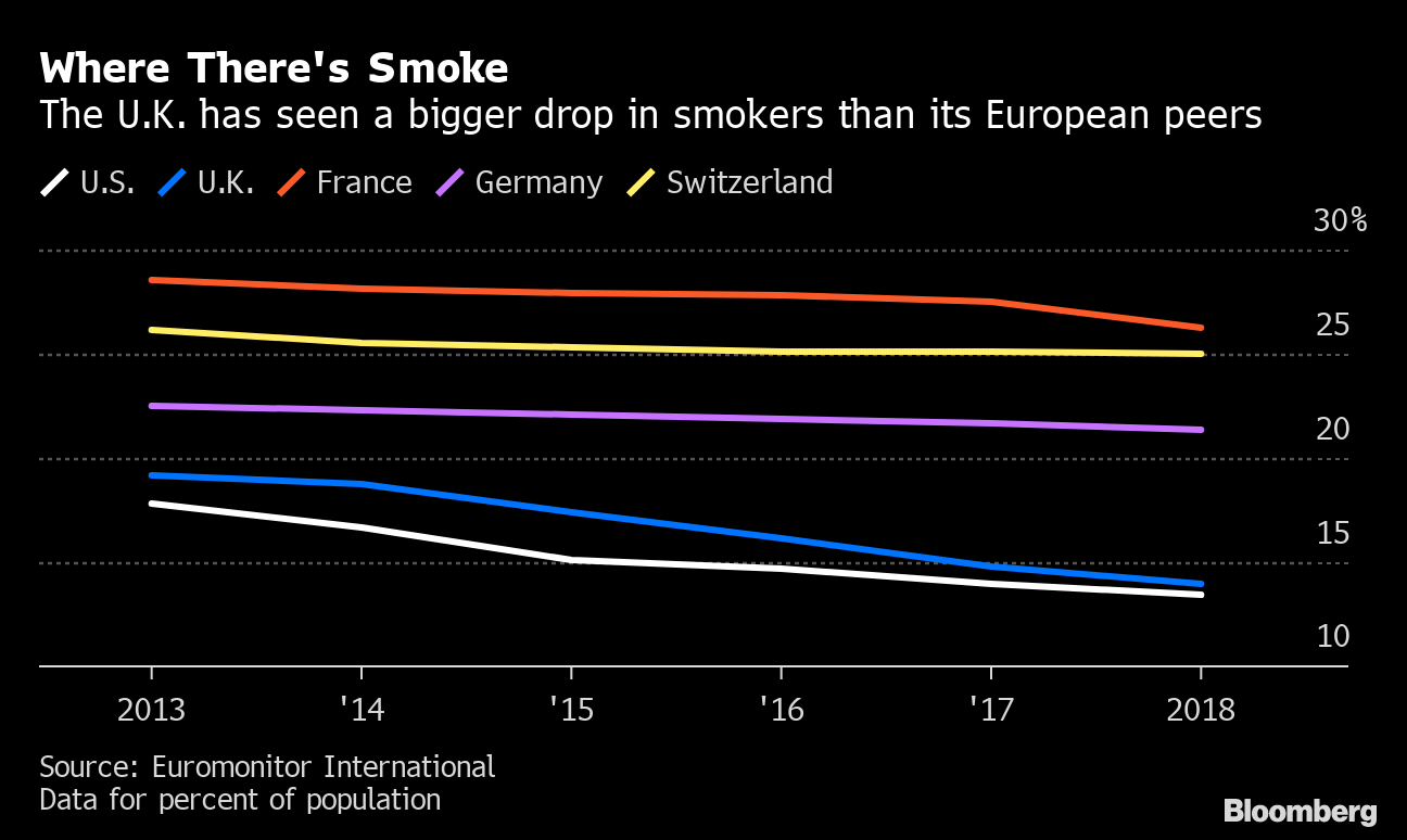 Lo que alinea a ambas regiones es que las tasas de tabaquismo han disminuido, mientras que las cifras del vapeo han aumentado. En EE.UU., alrededor de 13% de la población fumaba cigarrillos el año pasado, porcentaje inferior al 18% de 2013, según Euromonitor International. En Reino Unido, la tasa ha bajado a 14% desde 19%, aunque las caídas han sido más lentas en países como Francia y Alemania.