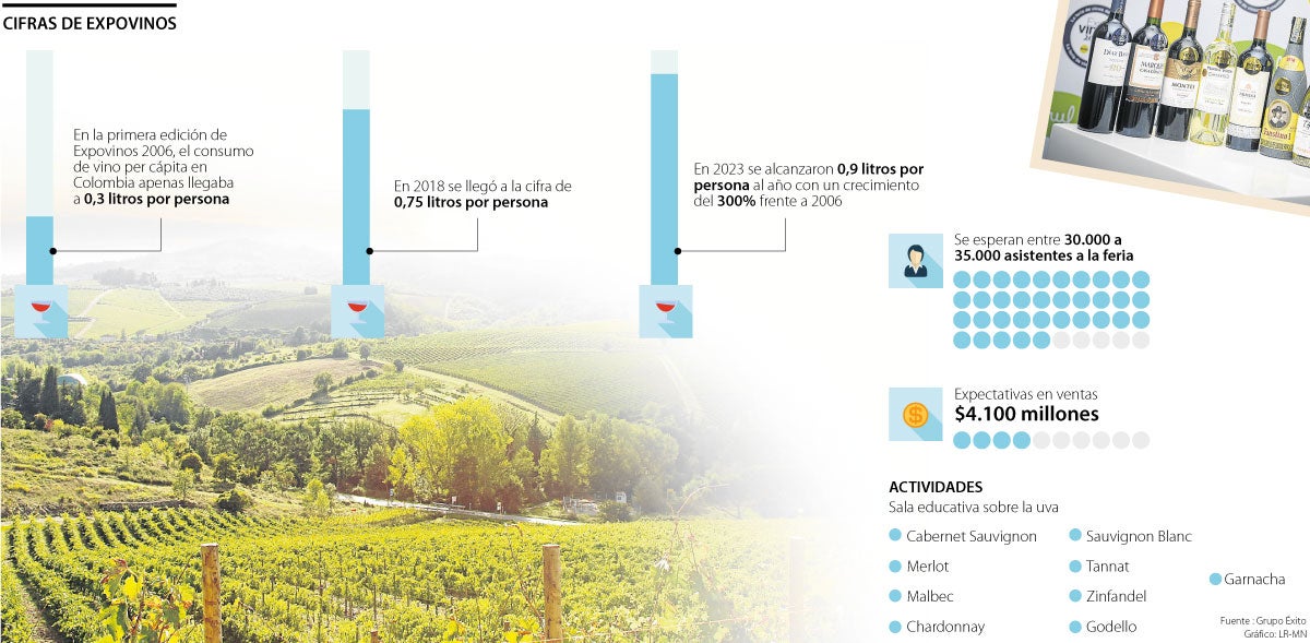 En Colombia, el vino viene creciendo de manera importante. De acuerdo con Carolina Cardona, en la primera edición de Expovinos 2006 el consumo de vino per cápita en Colombia apenas llegaba a 0,3 litros por persona.