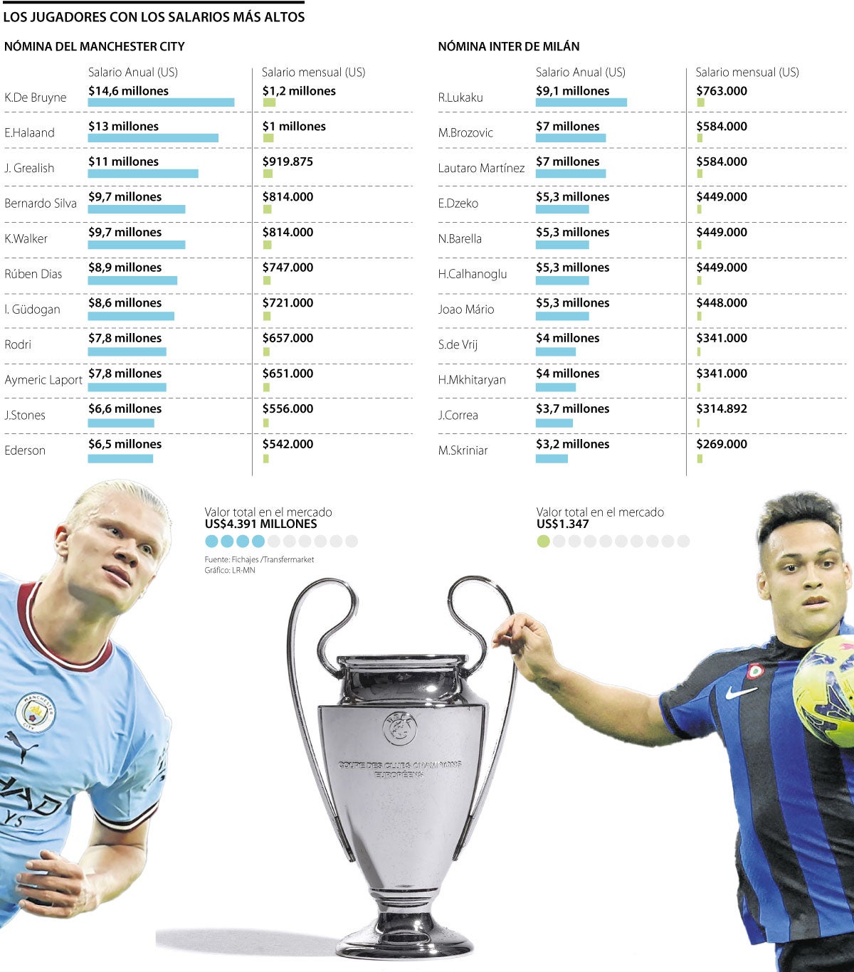 El análisis de las plantillas de ambos conjuntos también sentencia la ventaja clara del City, con un vestuario valorado en más de US$1.077 millones. A la cabeza está el poderoso Haaland, con US$183,1 millones, seguido de Foden (US$118,4 millones).