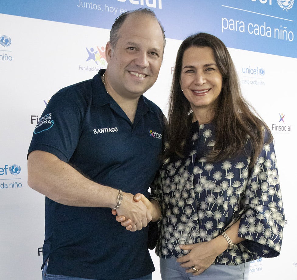 Finsocial y Unicef firmaron una alianza para apoyar la Estrategia Escuelas de Paz. Santiago Botero, CEO de Finsocial, y Viviana Limpias, Directora Adjunta de Unicef en Colombia.