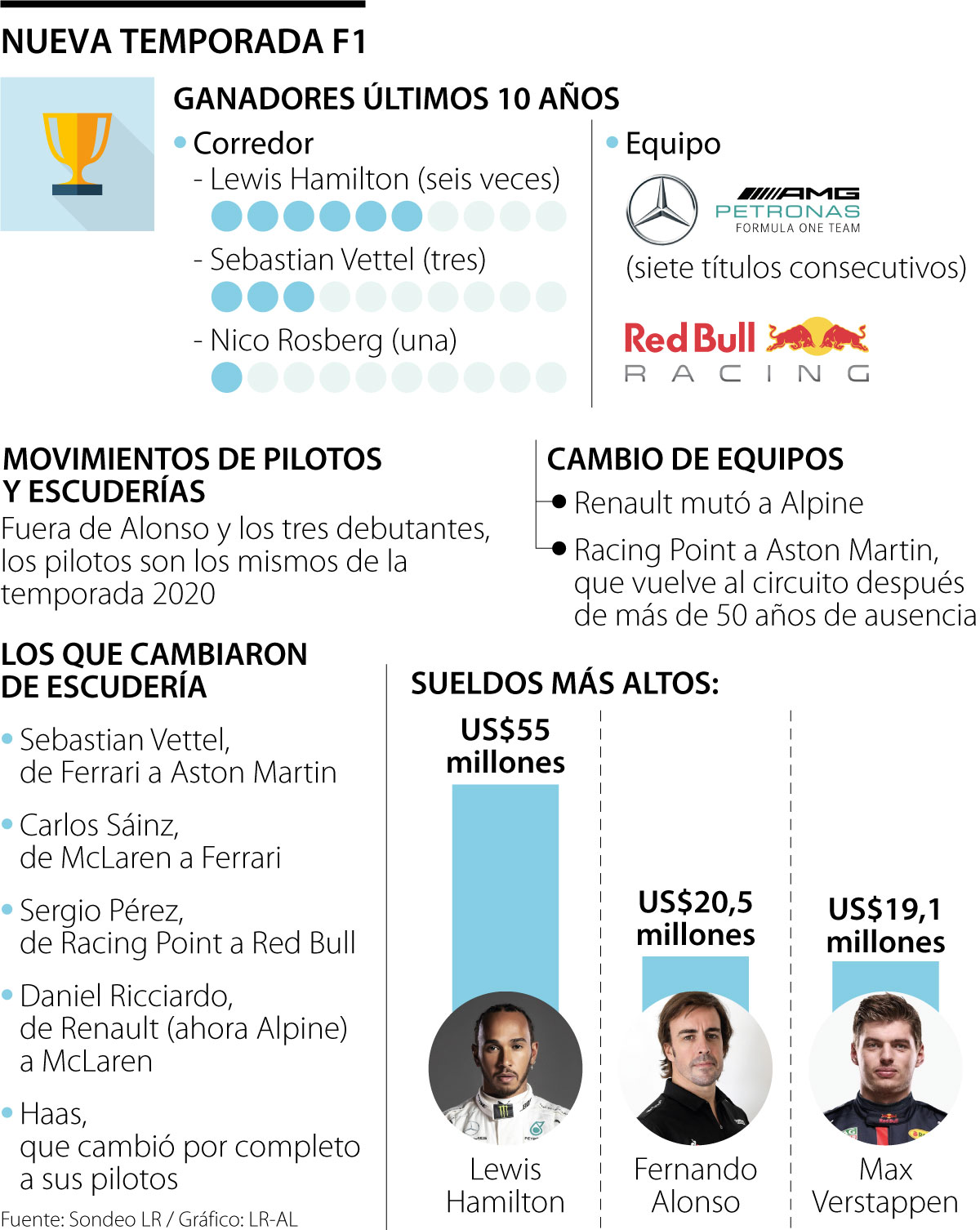 Regresos, cambios y debuts. Un total de 20 pilotos y 10 escuderías calientan motores para el arranque de la temporada 2021 de la Fórmula 1, a partir de este 28 de marzo.