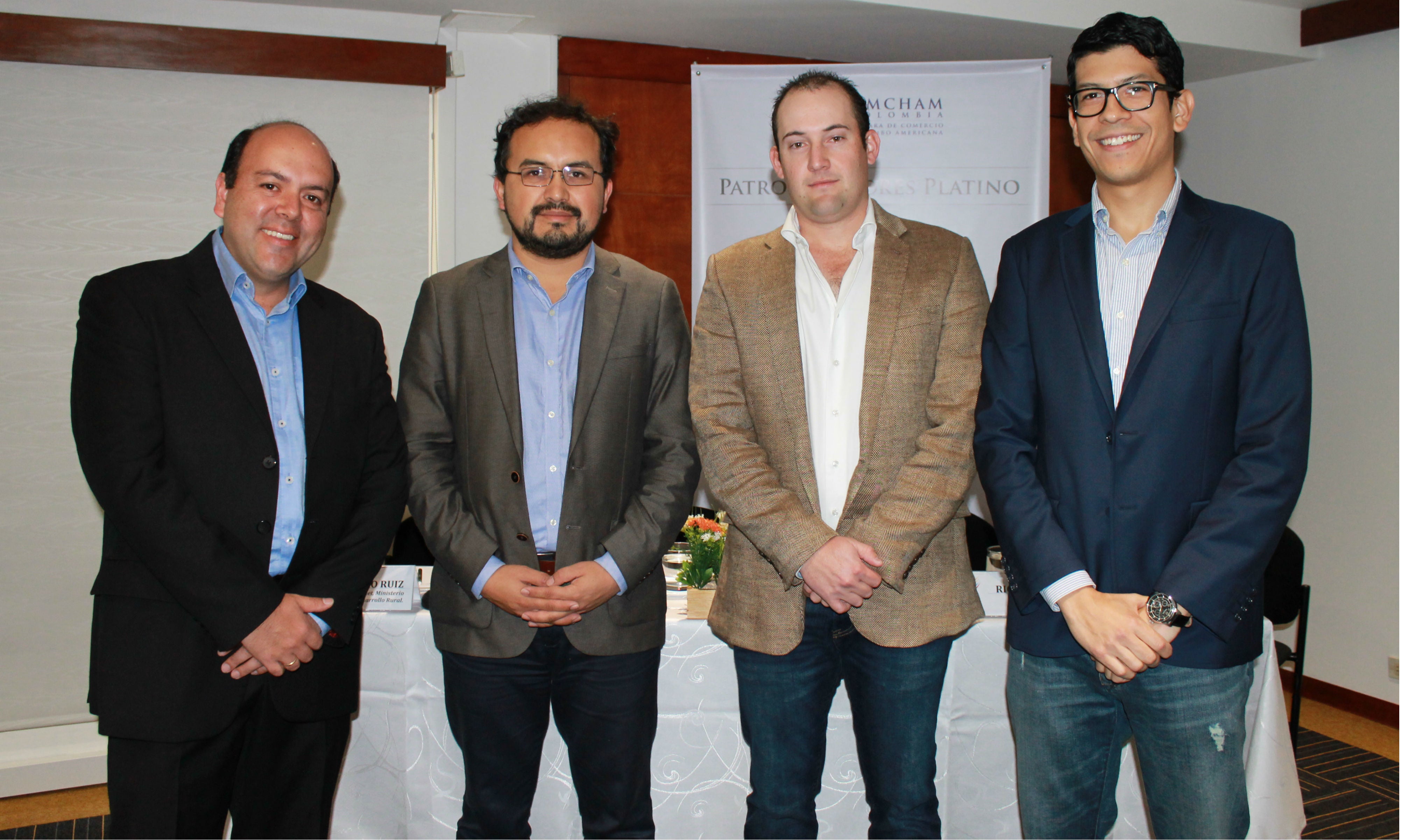 Foto: Ricardo Lozano, presidente del Comité TIC AmCham; Alejandro Ruiz, gestor Agronet-Ministerio de Agricultura; Alejandro Sáenz, vicepresidente del Comité Agroindustria AmCham; y Guillermo Zabala, director de Asuntos Jurídicos AmCham.